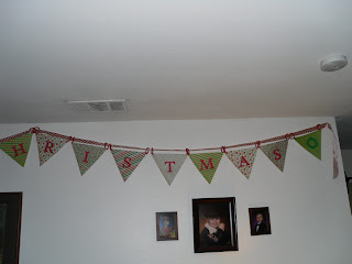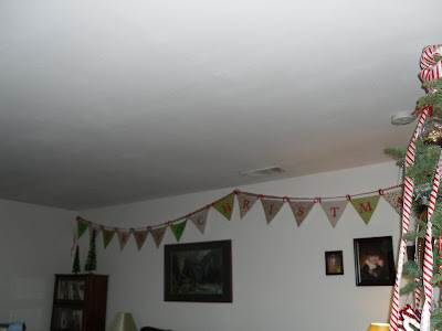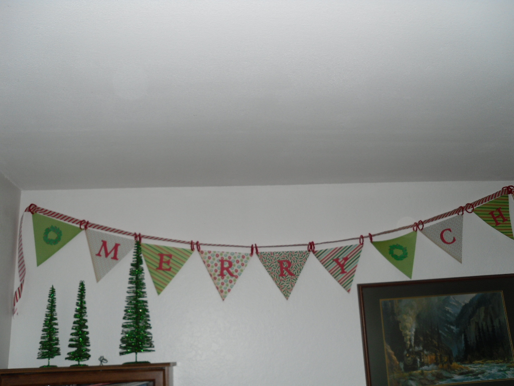 Using ribbon or cordage string pennants on and arrange according to length. I used ribbon to match the tree topper I made for our tree. Use clear thumb tacks to hang and viola! a finished low cost cute project in no time flat.