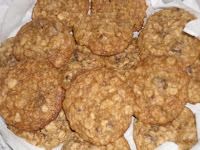 Today was cookie exchange in Small Group and all my joys of baking came into play. Um, baking and then sharing. Let us not forget the gathering with the gabbing and a nice hot cuppa. Yup, today was one of those days. Last night I stayed up late getting my 3 dozen ready to share this morning. The good thing about me baking is I get to share my recipes with everyone and now I'm starting to remember to take pictures of what I make. This one is adapted from under the lid of the Quaker Oats can. We don't like raisins and I really love to use nuts in my baking so here is my little yummy cookie. I use Butter not that evil abomination called margarine and double bourbon vanilla in place of regular or imitation.